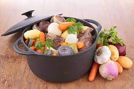 ……….. Sortir à l’écumoire la viande & les légumes pour les disposer sur le plat de service ( retirer le bouquet garni).