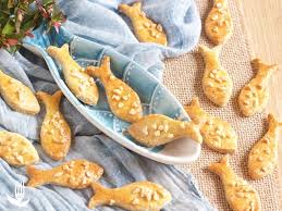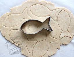 Etaler la pâte sur 1/2 cm … . Y découper des petits poissons ou toutes autres formes. au fur et à mesure, disposer les découpes de pâte, un peu espacées, sur la plaque du four.