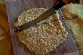 Dans une autre poêle pas trop petite, sur feu assez vif, fondre 30 g de saindoux ou de beurre …. Y couler les oeufs battus pour cuire rapidement une omelette assez plate …. La retirer du feu et la glisser sur une assiette … La découper en lanières … .