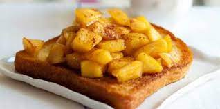 Dans la même poêle, rajouter 40 g de beurre. Y faire vivement sauter les pommes 3 mn puis les poudrer de 4 cuillères à soupe ( 100 g) de sucre et les laisser caraméliser en les remuant régulièrement ( 4 mn)……………….. Répartir les pommes sur le pain doré.