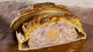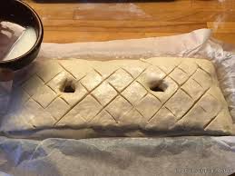 Découper 2 cheminées sur le dessus ( = 2 trous vers chaque coté du moule, d’environ 2 cm de diamètre) ………………… Strier le dessus du pâté à la pointe de couteau………… Badigeonner le dessus du pâté avec 1 jaune d’oeuf ( = le dorer).
