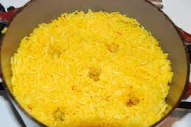 ………. Le riz ayant refroidi, retirer thym + laurier + la gousse d’ail entière ……………………………………. Lui incorporer le safran + la moitié des poivrons + les noisettes hachées + les raisins égouttés + la Mayonnaise ……………… .Bien mélanger.
