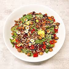 Mettre cette salade mixe dans un saladier………… Parsemer du reste de poivrons + les noisettes restées entières.