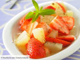 Dans un saladier, mélanger délicatement ananas + fraises + litchis + sucre glace + Kirsch….. .