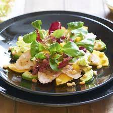 Réunir tous les éléments sauf le cresson dans un saladier + les 3/4 de la vinaigrette et mélanger délicatement et soigneusement ….. .Parsemer de cresson haché et napper du reste de vinaigrette.