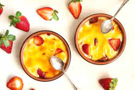 Répartir les fraises dans des plats bas à crème brûlée ou Crème Catalane.