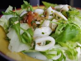 Dans un saladier, mélanger oignon + piment + menthe + Nam Pla + jus de citron + sucre …….. Verser sur les calamars refroidis et mélanger vivement 3 mn … .