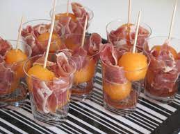 Disposer perles de melon et jambon dans des verrines ( des petits verres) en les alternant.