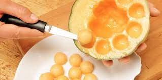 A l’aide d’une cuillère parisienne, prélever des billes de melon ( sans cuillère, retirer la chair et la couper en dés)……………. Mettre les billes dans un saladier. arroser de Porto. Laisser macérer au frigo 15 mn minimum.