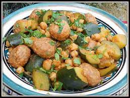 Dans le bas d’un plat à tajine ou bien dans un plat à gratin, étaler les pois chiches ………………. Recouvrir avec les tronçons de courgettes ……………………………….. Déposer les boulettes par dessus…………………………….. Arroser de sauce tomate …… .