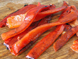 Découper les poivrons en lanières… Les disposer dans un ravier ( plat à hors d’oeuvre).