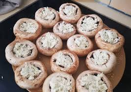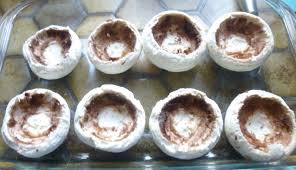 Remplir les têtes des champignons avec la préparation refroidie ……. Déposer les têtes farcies, au fur et à mesure, côte à côte, dans le plat à gratin…. .