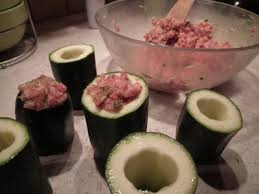 Couper les courgettes en tronçons de 5 cm …. Les évider avec une petite cuillère….. Les plonger 1 mn dans l’eau bouillante … Les égoutter.