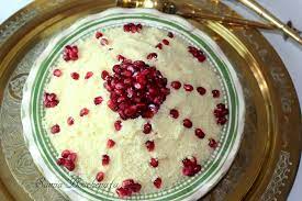 Décorer avec les fruits choisis, dans le creux de la couronne pour les raisins ou autour du dôme……… les dattes pour surmonter le couscous dans les 2 formes …. et les grains de grenade pour décorer.