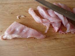 Découper en lanières les blancs de volaille cuits sans peau ( 25 mn dans du bouillon bouillant).