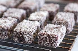 Tremper successivement chaque cube de gâteau 1) dans le chocolat fondu … puis 2) le rouler dans la noix de coco râpée … .