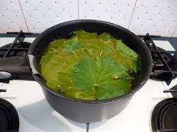 Rincer les feuilles de vigne et retirer les queues … Plonger les feuilles de vigne 3 mn dans l’eau bouillante ……….. Les égoutter …. puis les placer entre des feuilles de papier absorbant.