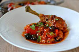 Dans une poêle, porter le vin blanc à ébullition……… Baisser le feu et ajouter ail + anchois + olives + tomates + poivre. Mélanger. Laisser doucement mijoter et compoter le temps de cuisson du poulet…. .