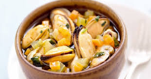 Gratter et rincer les moules…. Les mettre sur feu vif dans un faitout couvert pour 5 mn en secouant le récipient plusieurs fois ………………. .