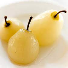 Dans une casserole, porter à ébullition 5 mn vin blanc + 100 g ( 4 cuillères à soupe) de sucre + muscade ……………….. Y plonger les demi-poires pour 20 mn …… .