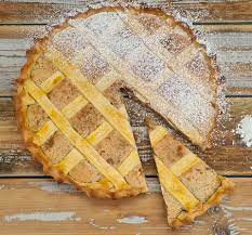 Abaisser le reste de pâte en une forme allongée….. Y découper des bandes d’environ 2,5 cm de large ….. Placer ces bandes sur la tarte en les croisant et les faisant se chevaucher pour faire un quadrillage sur toute la tarte………….. Pincer les bandes aux extrémités avec le fond de tarte pour bien les souder.