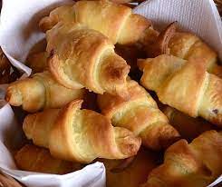 Rouler chaque croissant en partant du côté le plus large vers la pointe et en roulant un peu serré …………… . Recourber un peu les pointes vers l’intérieur pour obtenir des formes de croissants . Au fur et à mesure, déposer ces croissants, un peu espacés, sur la plaque du four.