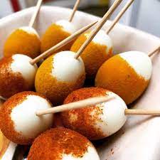 Faire durcir les oeufs dans de l’eau bouillante salée ( 10 mn pour les oeufs de poule et 5 mn pour les oeufs de caille) … . Les égoutter … Laisser tiédir. Retirer les coquilles.