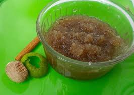 Dans une bassine à confiture en cuivre, un faitout ou une cocotte, porter à ébullition pour 5 mn: 50 cl ( 1/2 litre) d’eau + cassonade + noix de coco + zeste de citron + gousse et graines de vanille ( ou le sucre vanille) + cannelle + muscade tout en touillant vivement ……………. A 5 mn d’ébullition, baisser à feu doux pour environ 35 mn en mélangeant régulièrement ………………. .