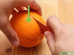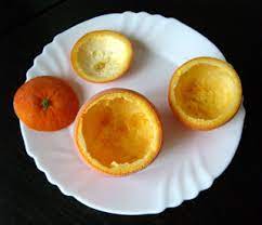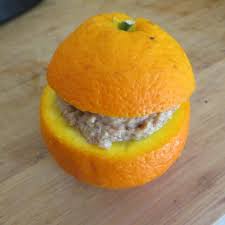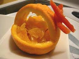 Couper les oranges en panier avec une anse ou bien leur retirer simplement un chapeau ….. Evider les oranges sans abimer l’écorce ( à l’aide d’une cuillère à pamplemousse avec des dents).. . Retirer les membranes et les pépins de chaque tranche. ………. Découper la pulpe en dés… Les mettre dans un saladier.