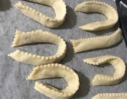 Laisser ainsi les rectangles ou les replier en « fer à cheval » ou bien les enrouler comme des « donuts »….. . Les déposer au fur et à mesure sur la plaque du four.. .