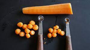 Dans les carottes pelées,, avec la cuillère parisienne, prélever des petites boules …. Les plonger 10 mn dans la 2ème casserole d’eau bouillante ….