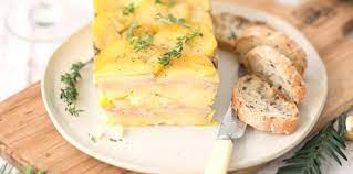 Dans une terrine, étaler 1 couche de pommes de terre … puis 1 couche de foie gras. Saler, poivrer — Recommencer 1 couche de pommes de terre puis de fois gras . Saler et poivrer ….. recommencer ainsi jusqu’à épuisement des ingrédients en terminant par 1 couche de pommes de terre salées et poivrées …..