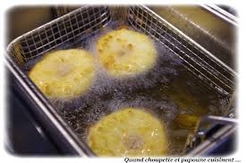 Tremper les tranches de fruits, des 2 côtés, dans la pâte à beignets … et aussitôt les plonger dans l’huile brûlante pour 2 mn de chaque côté ( les retourner à l’écumoire pour que les beignets soient bien dorés des 2 côtés !)… . — Procéder en plusieurs fournées car les fruits enrobés de pâte ne doivent pas se toucher en cuisant —