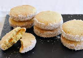 Tartiner de « Dulce de leche », les gâteaux et leur bord. Coller les gâteaux 2 par 2 ……… et les rouler dans la noix de coco pour en recouvrir les bords …………