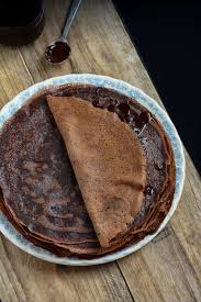 Pâte à crêpes: – Dans un saladier, battre les oeufs en omelette ……. Ajouter peu à peu farine + sel + cacao + café …. + lait pour obtenir une pâte fluide ….. Incorporer l’huile et mélanger à nouveau … .