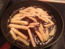 Dans une poêle sur feu vif, chauffer l’huile … Y faire cuire et dorer les frites ( 10 mn )…. .
