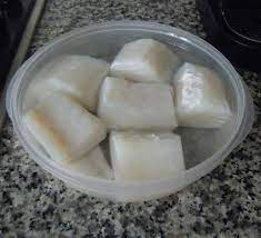 Cuire la morue: – Découper la morue dessalée en morceaux.. La placer dans une casserole…. Couvrir largement d’eau et, sur feu doux, porter à ébullition ( 7 à 8 mn) ……….. Retirer aussitôt du feu et laisser la morue refroidir dans son eau.
