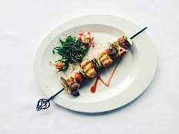 - Faconner les brochettes: – Huiler le bois ou le métal des brochettes ( le mieux est des brochettes métalliques plates). Alterner cubes de poisson et feuilles de laurier ( égouttées de leur eau de trempage) répartis sur chaque brochette…