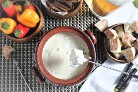 Accompagnement à tremper dans la fondue: pain pita à l’ail coupé en petits morceaux – petites pommes de terre nouvelle rôties dans leur peau ou bien pelées et cuites à l’eau ou à la vapeur – olives noires du Kalamata, dénoyautées – poivrons rouges ou jaunes coupés en morceaux ……