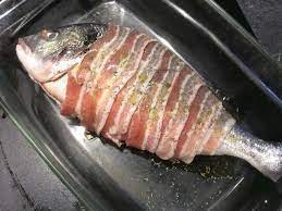 Entourer la daurade avec les fines tranches de lard fumé. ( ficeler éventuellement pour les maintenir en place).