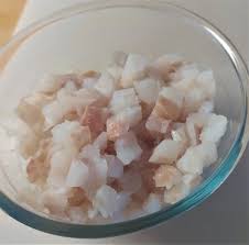 Fendre les filets de poisson en 2 dans l’épaisseur puis les détailler en mini dés.