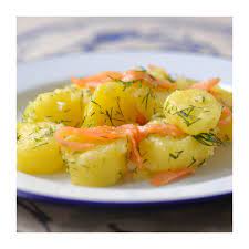 Dans un saladier, mélanger délicatement pommes de terre + saumon fumé + le contenu du bol.