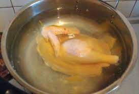 Déposer le poulet das un faitout + les rondelles de gingembre + 2,5 litres d’eau. Porter à ébullition pour 10 mn puis couvrir à petit frémissement pour 25 mn … . Eteindre le feu et laisser le poulet refroidir dans le bouillon…. .