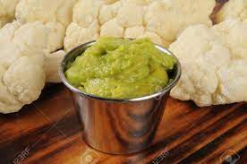 Mettre me chou-fleur dans un saladier. Le napper de guacamole et mélanger délicatement.