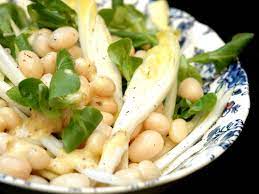 Recouvrir la salade de feuilles d’endives entières ( moi, je préfère les émincer dans la longueur) + le reste de vinaigrette. Mélanger à nouveau.