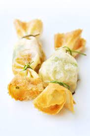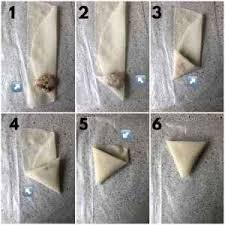 Tailler les feuilles de bricks en bande. Vous pouvez soit faire des bonbons, soit plier en triangle comme des samossas.