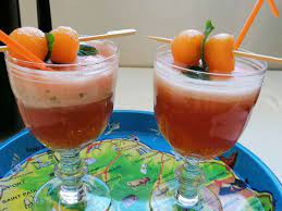 Verser le jus de melon obtenu dans une carafe. Verser la même quantité de Porto ………….. + moitié moins de Cognac( = 2/5ème de melon + 2/5ème de Porto + 1/5ème de Cognac) + 2 cuillères à soupe de sucre en poudre.