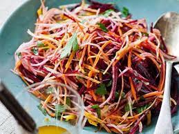 Dans un saladier, mélanger délicatement betteraves + carottes + petits oignons + raisin + carvi + sel + poivre.
