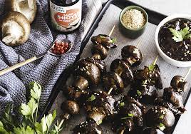 Façonner les brochettes: – Sur les pics à brochettes, enfiler en les alternant 1 tronçon d’anguille + 1 champignon + 1 oignon … + 1 morceau d’anguille ….. etc jusqu’à épuisement des ingrédients.