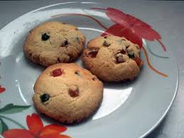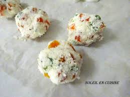 Former les boules aux fruits: – Prélever de la pâte gros comme une balle de golf et la rouler en boule……. Insérer au milieu de chacune 1 morceau de fruits confits + 1 fruit sec – exemple: 1 grain de raisin + 1/2 cerise confite … ou bien qq dés d’angélique + 1 cerneau de noix …. ou 1 raisin + 1 cerneau de noix … etc ……………. Bien refermer chaque boulette pour recouvrir intégralement les fruits.
